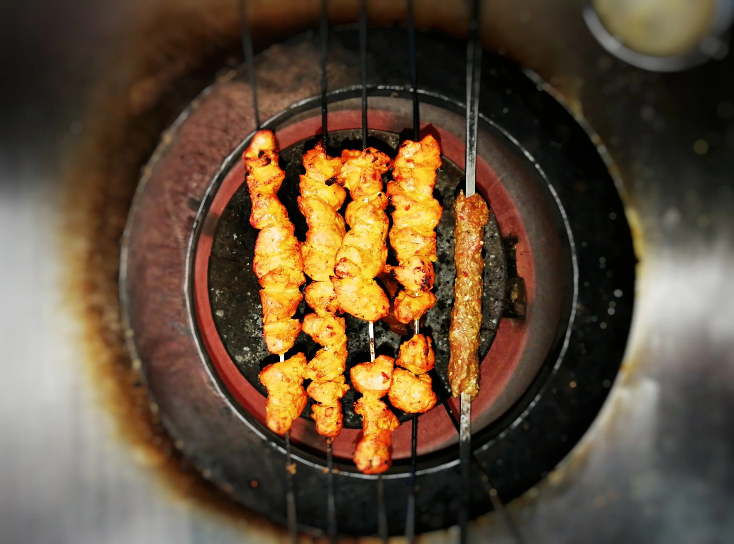 Chicken Tikka (1 skewer), beef Tikka (1 skewer) and Kabab served with yogurt chutni and spicy onion sauce.